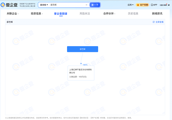 爱企查App显示,邵艺辉全资持股上海红拂不复还文化传媒有限公司1家企业,并担任该公司的法定代表人、股东、董事。作品著作权显示,该公司已为《好东西》、《爱情神话》登记著作权,作品类别为文字。