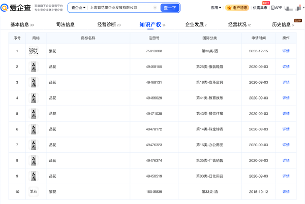 爱企查App显示,辛芷蕾经纪公司——上海繁花里企业发展有限公司成立于2018年8月,注册资本1000万元,知识产权信息显示,其作为电视剧《繁花》的出品方之一,目前已申请注册繁花商标。